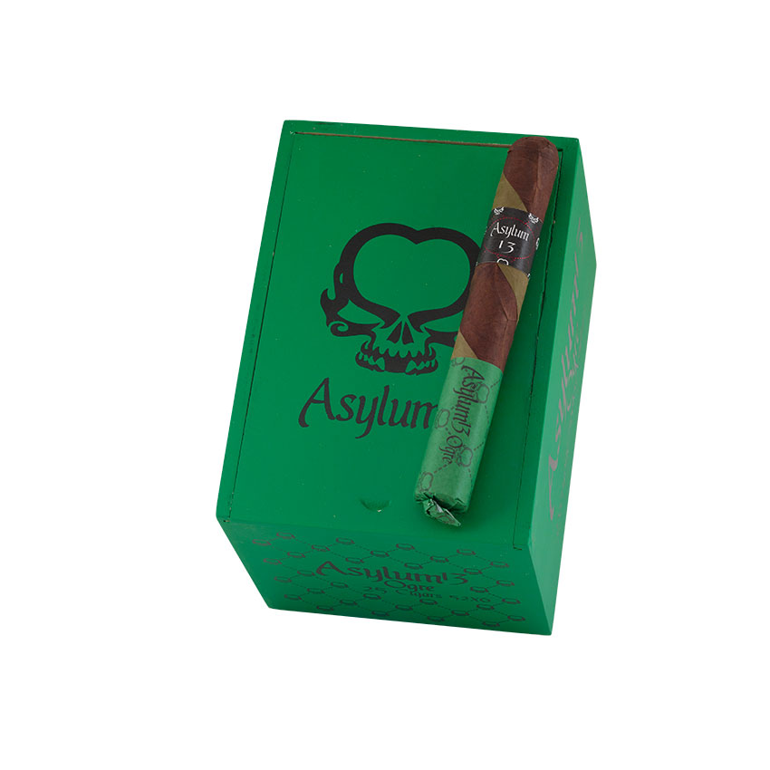 Asylum 13 The Ogre cigars are rolled barber pole style in dual Nicaraguan Habano and Candela wrappers, plus an all Nicaraguan filler & binder core, for one of the most complex and intriguing puros you’ll ever put to your lips. The Ogre ring sizes range from a 5×50 Robusto to a 6×80 tree trunk. The smoke is ultra-smooth with layers of flavor that are revealed inch-by-savory inch. Each cigar is protected by a tissue paper over-wrap and presented in boxes of 30 or 50 cigars. Order yours now.